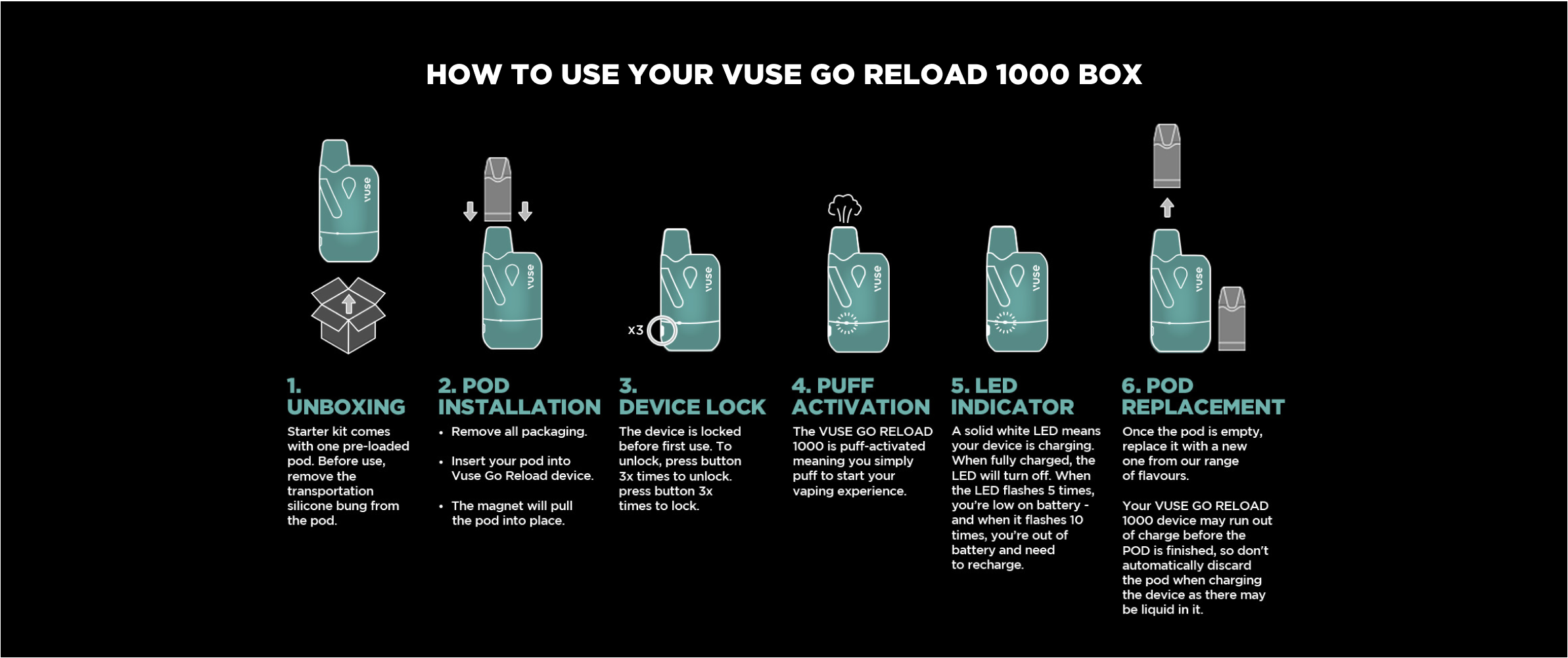 The Vuse GO Reload 1000 device is puff-activated meaning you simply puff to start your vaping experience.